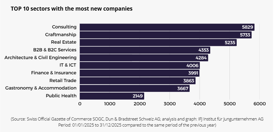 The top three sectors this year are consultancy (5'829 startups), craft (5'733 startups) and real estate (5'235 startups). They are followed by B2B & B2C services (4'353 startups) and architecture & engineering (4'284 startups).