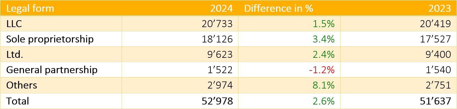 In Switzerland, sole proprietorships are the fastest-growing legal form in 2024, with growth of +3.4% compared to the same period last year. The public limited company (Ltd.) follows with solid growth of +2.7%, while the limited liability company (LLC) grew by +1.5% and remains the most popular legal form for startups.