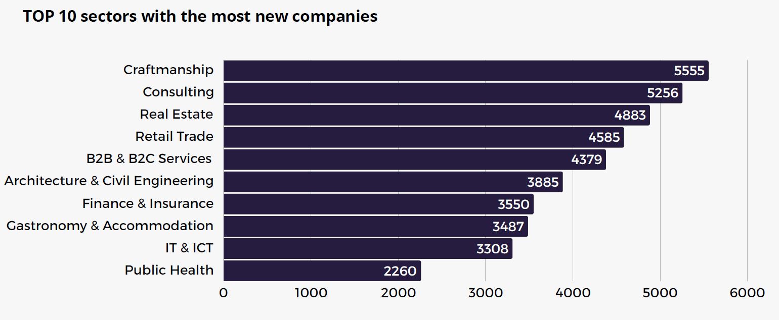 The top three sectors this year are craft (5'555 startups), consultancy (5'256 startups) and real estate (4'883 startups). They are closely followed by retail trade (4'585 startups) and B2B & B2C services (4'379 startups).