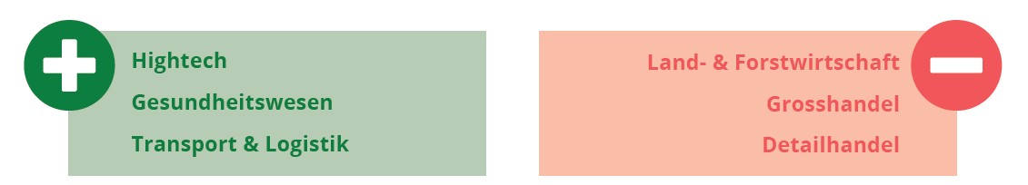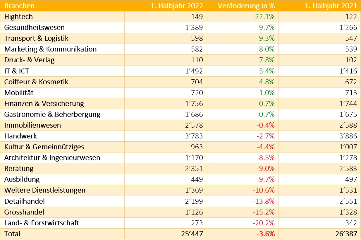 Zu den top Wachstumsbranchen im laufenden Jahr gehört Hightech (+22.1%), Gesundheitswesen (+9.7%) sowie Transport & Logistik (+9.3%). Die höchsten prozentualen Rückgänge verzeichnen Land- & Forstwirtschaft (-20.2%), Grosshandel (-15.2%) sowie der Detailhandel (-13.8%).Die Analyse zeigt, dass vor allem der Handel stark zu kämpfen hat. Nebst den zwei gründungsintensiven Branchen Gesundheitswesen und IT & ICT verzeichnen vor allem kleinere Branchen positive Akzente.