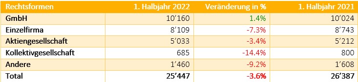 In der Schweiz ist die Gesellschaft mit beschränkter Haftung (GmbH) mit Abstand die beliebteste Rechtsform, wenn es um die Gründung einer neuen Firma geht. Insgesamt 10'160 (+1.4%) neue GmbH wurden im 1. Halbjahr 2022 eingetragen. Relativ hoch ist der Rückgang von -7.3% an neu gegründeten Einzelunternehmen, welche mit über 8'100 Neueinträgen, die am zweithäufigste gewählte Rechtsform ist..jpg)