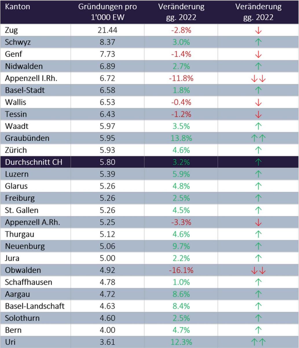 Mit einer Gründungsdichte von 21.44 pro 1'000 Einwohner/innen im 2023 haben wir einen klaren Gewinner - den Kanton Zug. Dies ist aufgrund der steuerlichen Vorteile für Unternehmen und der positiv herrschenden Gründungsstimmung im Kanton keine Überraschung. Platz Nummer zwei mit einer Gründungsdichte von 8.37 sichert sich der Kanton Schwyz gefolgt vom Kanton Genf mit 7.73.Auffallend positive Veränderungen im Vergleich zum Vorjahr 2022 sind beim Kanton Graubünden (+13.8%) und dem Kanton Uri (+12.3%) beobachtbar. Eine starke Abnahme weisen die Kantone Obwalden (-16.1%) und Appenzell I.Rh. (-11.8%) vor. Die hohen prozentualen Schwankungen sind jedoch mit der geringen Grösse dieser Kantone begründbar.