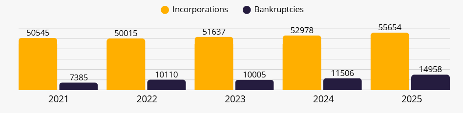 To obtain a comprehensive picture of business dynamics, we have prepared the key annual figures for 2025 together with Creditreform based on the most up-to-date data. In recent years, the number of bankruptcies has also increased. The following chart shows the development of company bankruptcies in a multi-year comparison.
