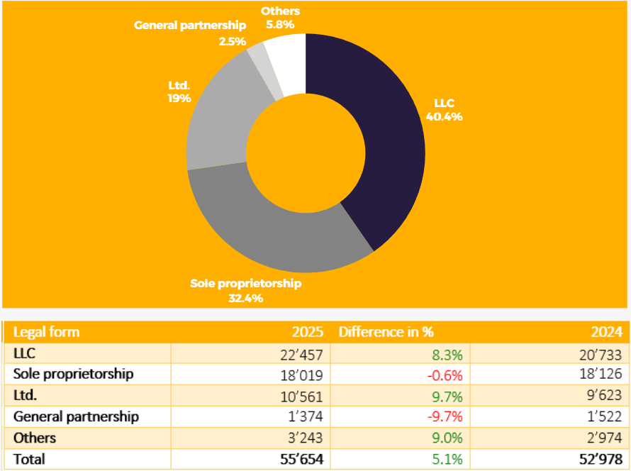 In Switzerland, public limited companies (Ltd.) are the fastest-growing legal form in 2025, with growth of +9.7% compared to the same period last year. The limited liability company (LLC) grew by +8.3% and remains the most popular legal form for startups.