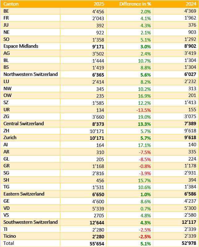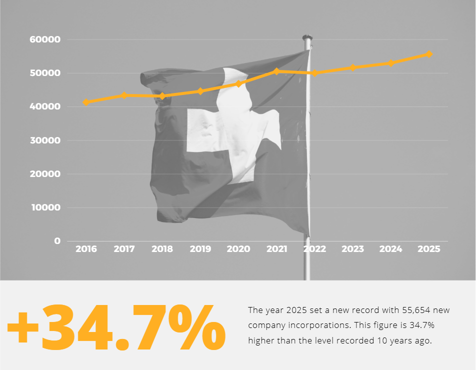 The new record for company incorporations in 2025 shows a very positive trend. On average over the last 10 years, 48'019 new companies were registered in the Swiss Commercial Register each year. With 55'654 new companies, 2025 records the highest level and, at +15.9%, is well above the average of previous years.