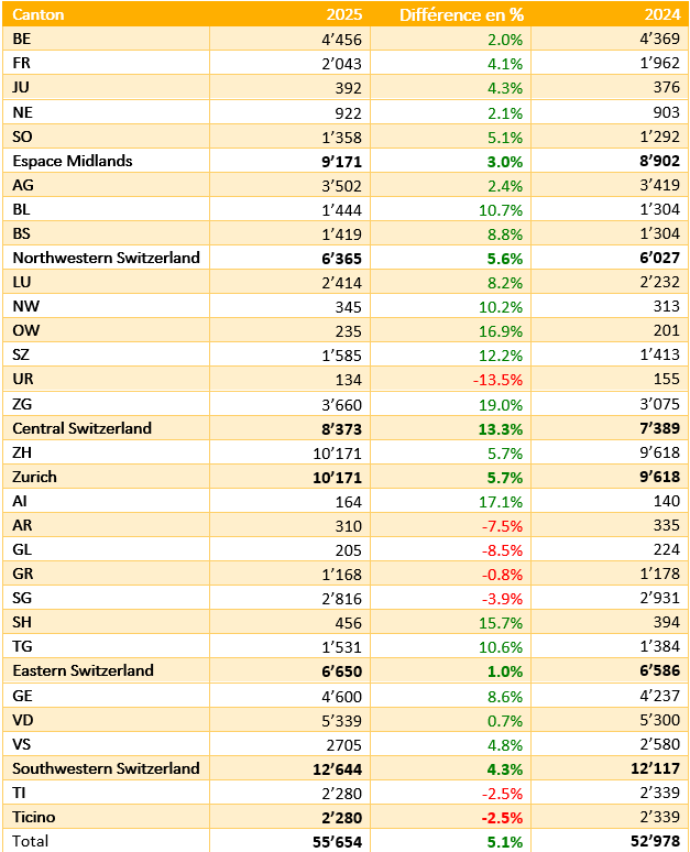 Dans 20 cantons, le nombre de créations d’entreprise en 2025 a augmenté par rapport à l’année précédente. Les cantons affichant la plus forte croissance sont Zoug (+19,0 %), Appenzell Rhodes-Intérieures (+17,1 %), Obwald (+16,9 %), Schaffhouse (+15,7 %), Schwytz (+12,2 %), Bâle-Campagne (+10,7 %), Thurgovie (+10,6 %), Nidwald (+10,2 %), Bâle-Ville (+8,8 %), Genève (+8,6 %), Lucerne (+8,2 %), Zurich (+5,7 %), Soleure (+5,1 %), Valais (+4,8 %), Jura (+4,3 %), Fribourg (+4,1 %), Argovie (+2,4 %), Neuchâtel (+2,1 %), Berne (+2,0 %) et Vaud (+0,7 %).