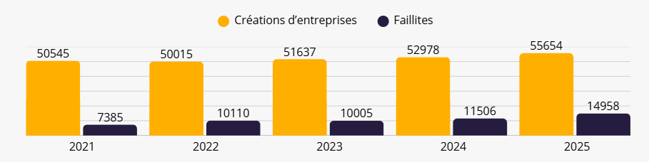 Afin d’obtenir une vue d’ensemble complète de la dynamique des entreprises, nous avons préparé, en collaboration avec Creditreform, les principaux chiffres annuels 2025 sur la base des données les plus récentes. Au cours des dernières années, le nombre de faillites a également augmenté. Le graphique ci-dessous montre l’évolution des faillites d’entreprises dans une comparaison pluriannuelle.
