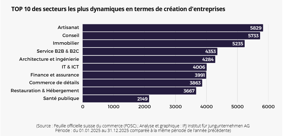 L’analyse sectorielle met en évidence une grande diversité. Parmi tous les secteurs, le conseil arrive en tête avec 5'829 créations, représentant 10,5 % de l’ensemble des nouvelles entreprises. Cette dynamique souligne la vitalité du paysage entrepreneurial suisse et constitue un signal positif pour une économie qui continue de bien fonctionner.