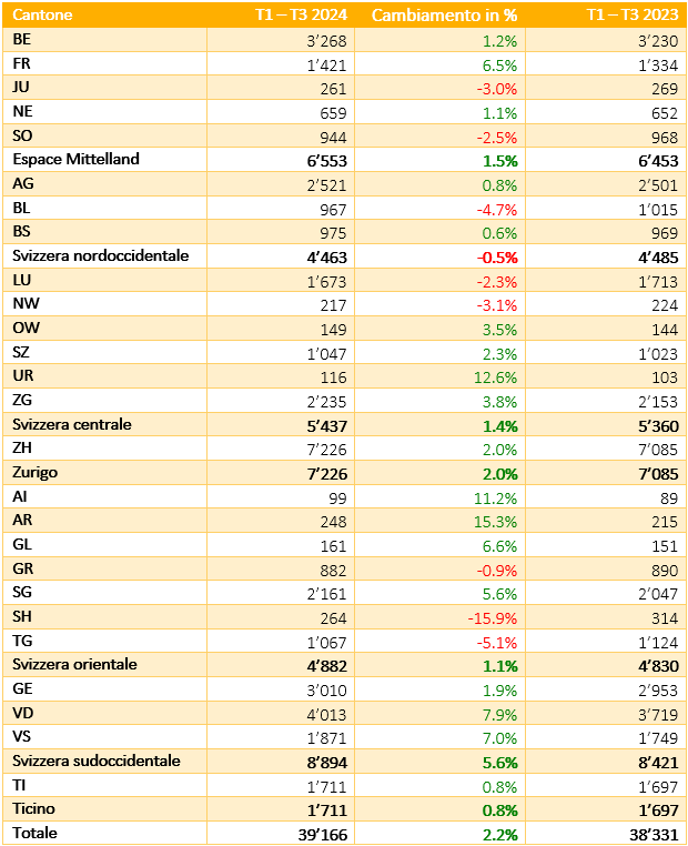 Nel periodo dal 01.01. al 30.09., la Svizzera sud-occidentale (+5,6%) e la regione di Zurigo (+2,0%) sono le grandi regioni con l'aumento più significativo. Anche la regione Espace Mittelland (+1,5%), la Svizzera centrale (+1,4%), la Svizzera orientale (+1,1%) e il Ticino (+0,8%) registrano dati molto positivi, mentre la Svizzera nord-occidentale (-0,5%) mostra un leggero calo.