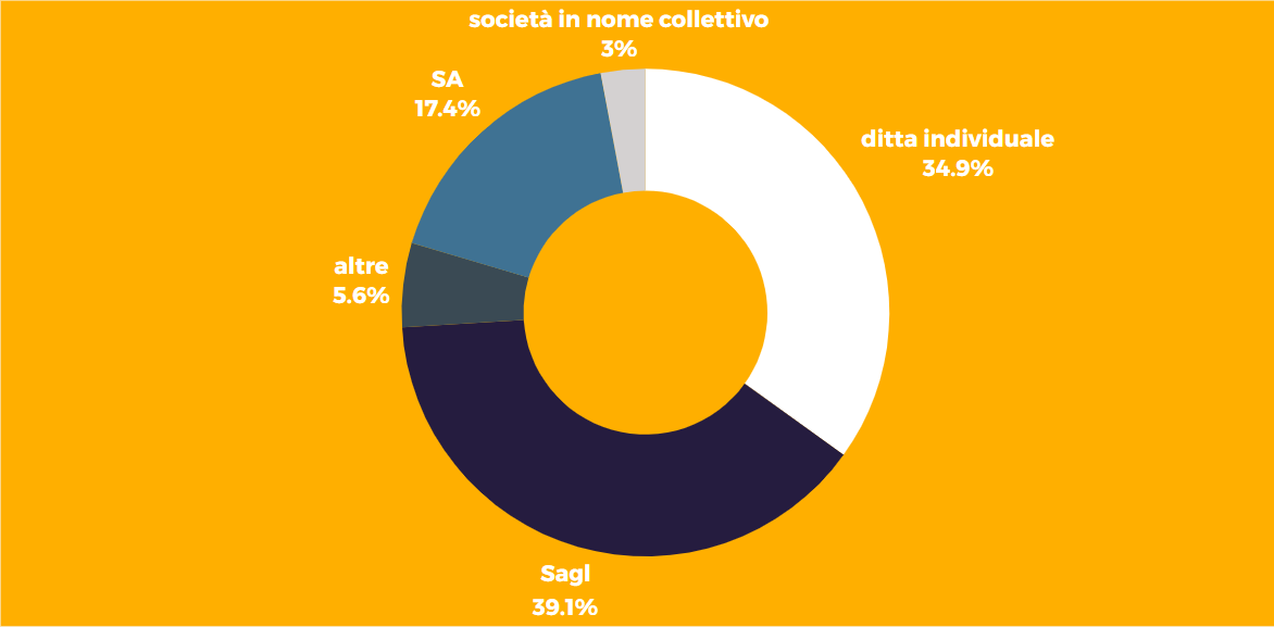 I cantoni che hanno registrato solo lievi perdite percentuali sono Grigioni (-0,9%), Giura (-3,0%), Nidvaldo (-3,1%), Soletta (-2,5%), Lucerna (-2,3%). Un calo più marcato è stato registrato nel cantone di Basilea Campagna (-4,7%) e in Turgovia (-5,1%). Il calo percentuale più forte nelle nuove fondazioni è stato registrato all'Ufficio del registro di commercio del cantone di Sciaffusa (-15,9%).Confronto delle forme giuridiche