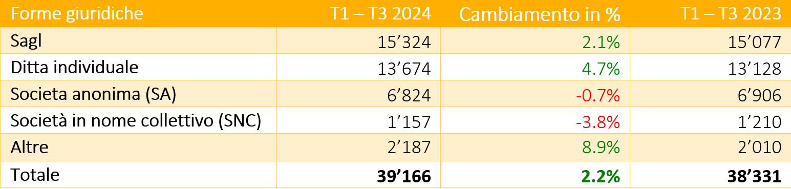 In media, 37'183 nuove aziende sono state registrate tra il 1° gennaio e il 30 settembre negli anni dal 2020 al 2024. Con una crescita del +5,3% rispetto alla media quinquennale e del +2,2% rispetto allo stesso periodo dell'anno precedente, i primi tre trimestri del 2024, con 39'166 nuove fondazioni, segnano un livello record, nettamente al di sopra della media.